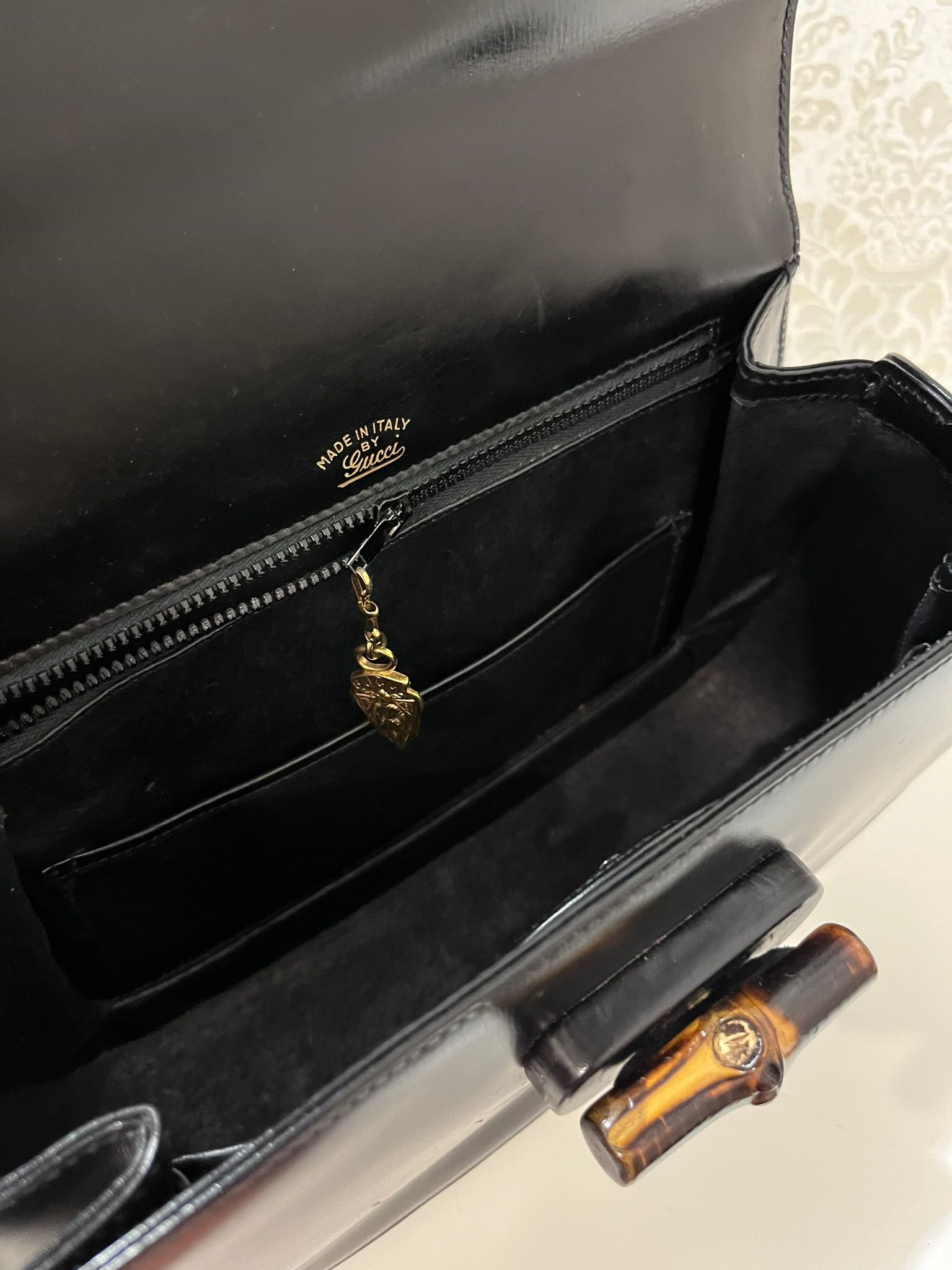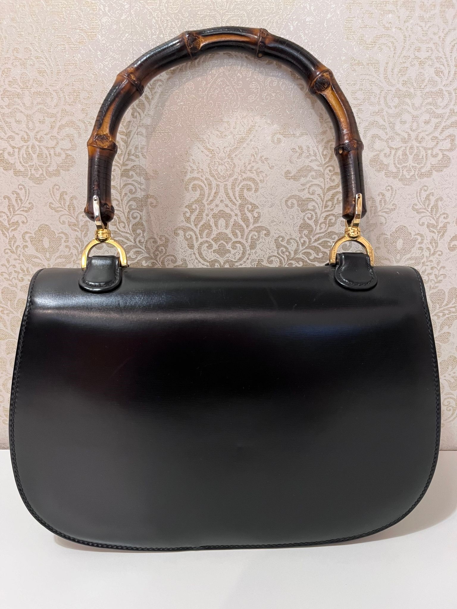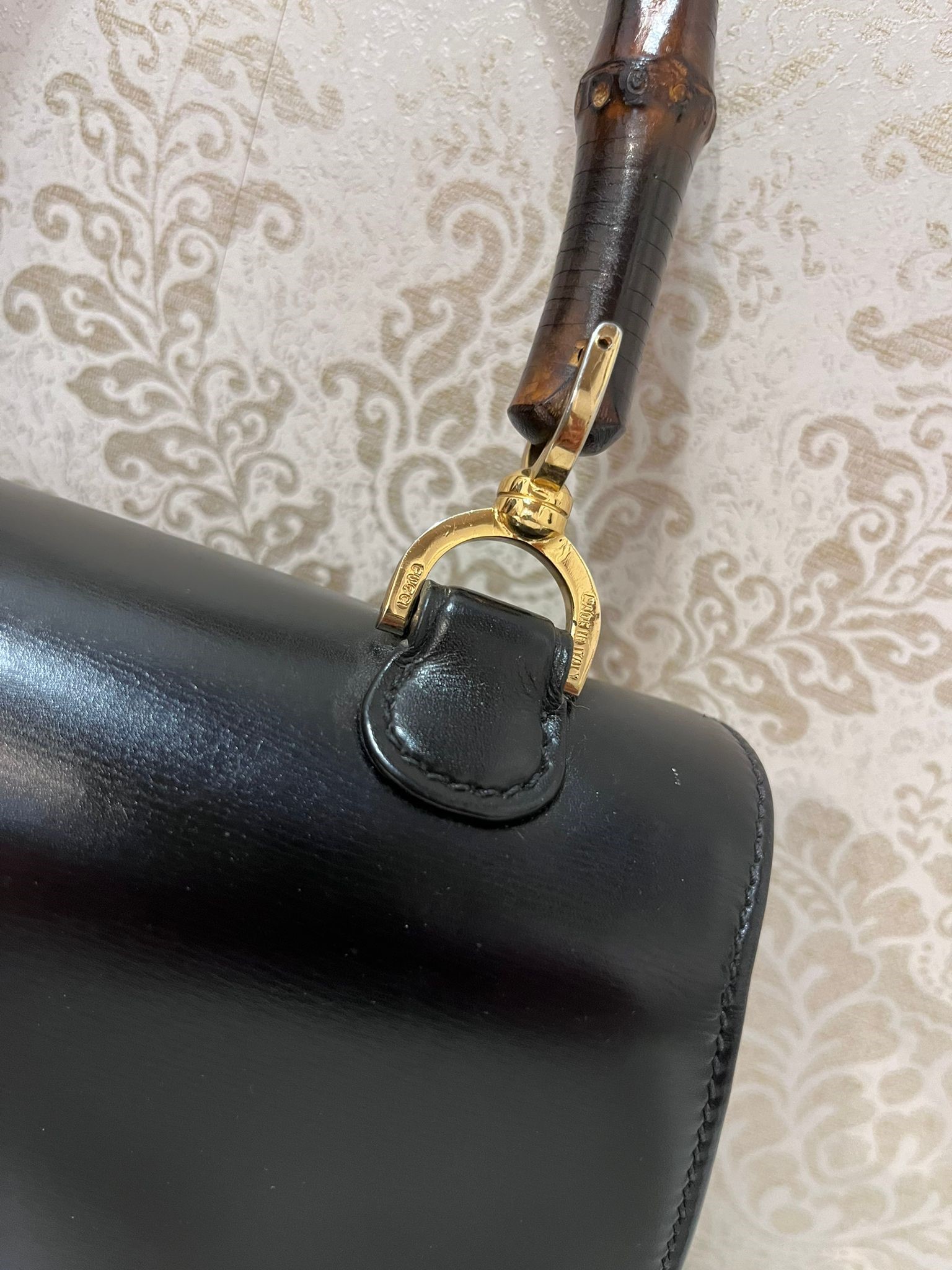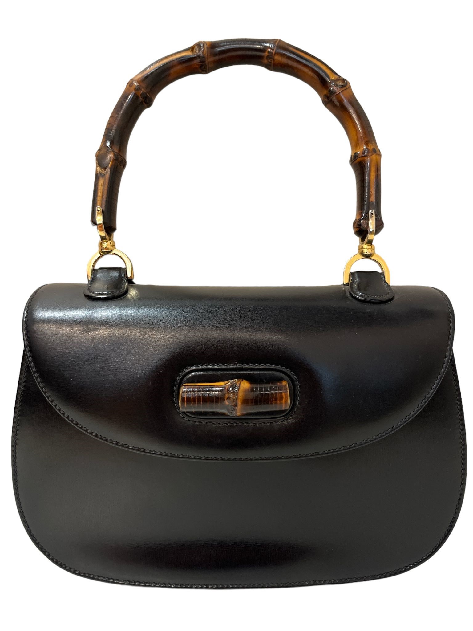 Borsa a mano Gucci dallo stile senza tempo, in pelle e bambù. Parti metalliche in color oro, manico superiore e girello frontale in bambù. Doppia tasca interna con chiusura a zip e clip. Questo articolo pre-owned nonostante il tempo si presenta in buone condizioni, segnaliamo qualche graffio dovuto a sfregamento della pelle. Dust bag non inclusa. Misure 20 x 27 x 9 cm.